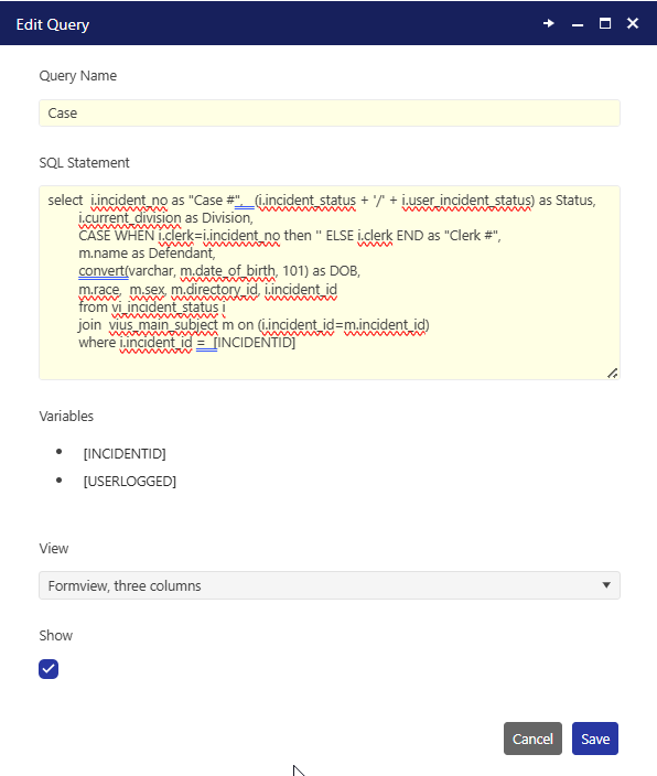 | Indicates the 2 variables that can be used in the SQL statement (IncidentId or Userlogged). Users are able to select the variable from the screen to add the variable into the SQL Statement. |