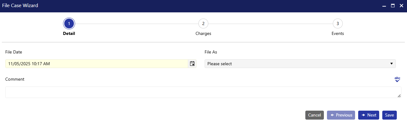 The "File As" field is the Event Sub Type list of the FILED event type. In the new File Case Wizard there is no Charge Type selection, it will always mark the charges as FILED.