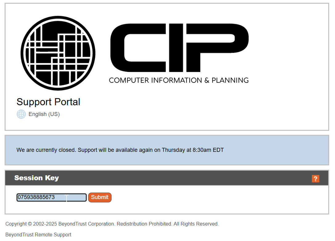 2. Type the Session Key provided by CIP Support representative and select Submit.