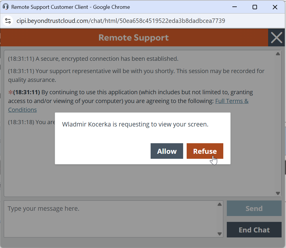4. Beyond Trust will automatically request to share the screen. Select Refuse.