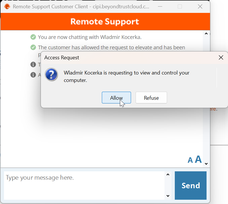 5. CIP Support representative will request to elevate access to full remote support. Select Accept.