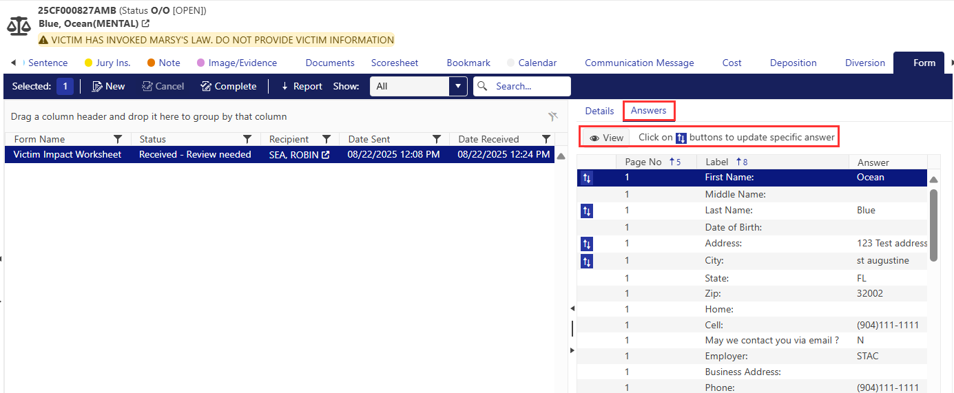 Users can review the answers and mark a form as complete in the Form tab. Users also have the ability to filter by forms that have been created, sent, reviewed, and completed. Users can also update the information in STAC from the answers that the recipient provides in the forms.